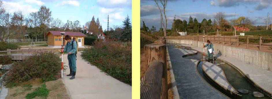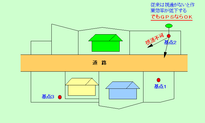 家屋密集地は衛星の電波が届きにくいため電波をキャッチした所からトランシットで測量することになる。